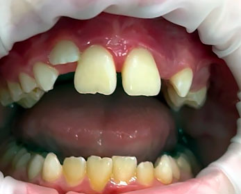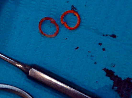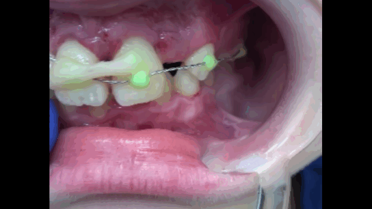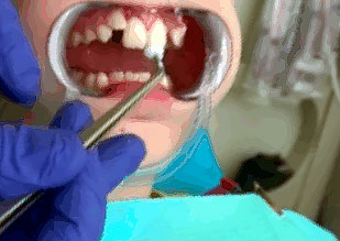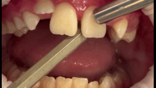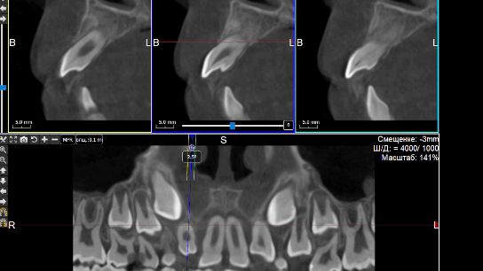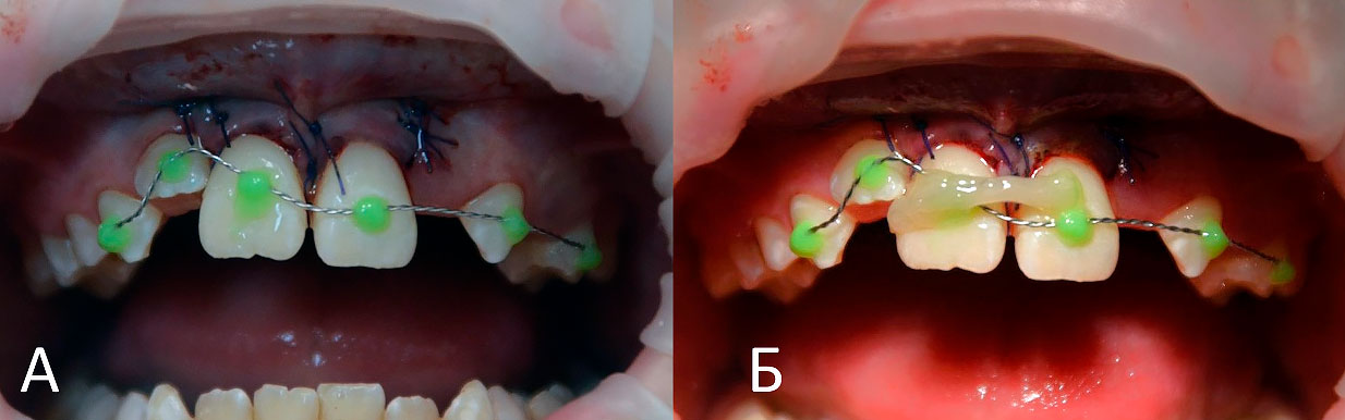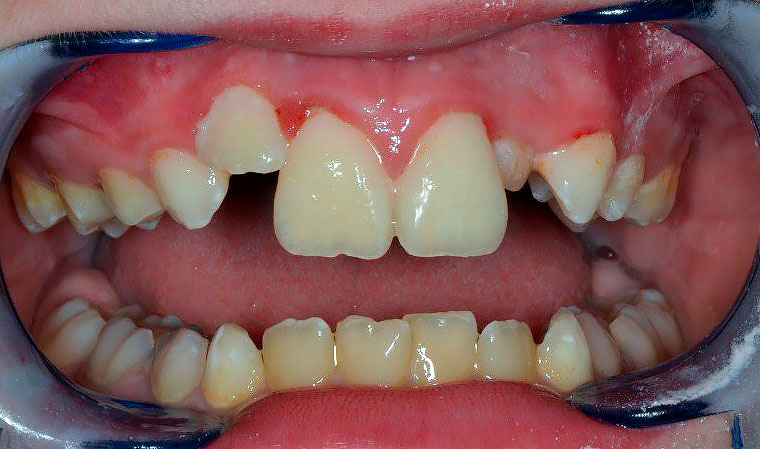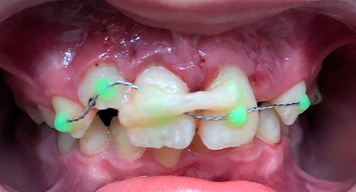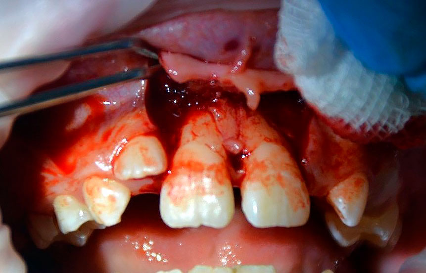 Конкурс «На самый интересный клинический случай 2025»Клинический случай № 5Извлечение инородных тел из тканей пародонта центральных резцов верхней челюсти пациента после неконтролируемого ортодонтического леченияВведение В иностранной литературе, начиная с конца 19 века описаны случаи травмы пародонта при ношении эластических колец, назначенных врачом-ортодонтом для устранения диастемы у детей [McQuillen, J.H., 1870]. Отсутствие ретенционных элементов, должного строгого контроля безопасности ношения и позднее обращение родителей приводит к тому, что под действием эластической силы, стремящейся вернуть эластическое кольцо в исходное состояние, происходит его смещение в ткани пародонта на различную глубину. Помимо механического разрыва периодонтальных волокон, возникает острое и затем хроническое воспаление в пародонте. В некоторых случаях прогрессирующее воспаление является причиной удаления постоянных зубов во фронтальном отделе у детей [Rubel I., 1980]. К сожалению, поиск отечественных научных работ по данной проблеме в поисковых системах Elibrary, search.rsl.ru, Киберленинка и Google Академия не дал положительных результатов, имеются только отдельные публикации клинических случаев в сети интернет и на специализированных стоматологических форумах. Клинический случай В сентябре 2024 года в детское стоматологическое отделение ГКБ по неотложной помощи обратились родители с сыном 9 лет с жалобами на периодическую боль в области верхней челюсти, подвижность зубов 1.1, 2.1, боли при накусывании на эти зубы. Анамнез заболевания: со слов матери пациента, врачом-ортодонтом из ЛПУ по месту жительства около 3 месяцев назад для устранения диастемы на верхней челюсти назначено домашнее ношение ортодонтических эластических колец, которые они должны были надевать на центральные резцы. Со слов матери пациента, ребенок мог самостоятельно снимать и надевать эластические кольца по своему желанию. Жалобы на периодическую боль в области центральных резцов обнаружили примерно за 2 месяца до визита, а подвижность за неделю до обращения. При клиническом осмотре конфигурация лица не изменена, регионарные лимфатические узлы не увеличены, безболезненные, подвижные, открывание рта не затруднено. Осмотр полости рта: зубы 5.3, 6.3 прорезаны полностью, коронка интактная, подвижность отсутствует, зуб 1.2 в стадии прорезывания, имеет вестибулоположение, коронка интактная, подвижность отсутствует, зуб 2.2 в полости рта не прорезался. Зуб 6.4 в полости рта отсутствует, зуб 6.5 коронка интактная, подвижность отсутствует. Зубы 1.1, 2.1: визуализируется диастема, коронки зубов интактные, в цвете не изменены, патологическая подвижность 2 степени, перкуссия болезненная. Холодовая проба: положительная кратковременная реакция. При зондировании пародонтологическим зондом (вестибулярно и нёбно в трех точках) определяются патологические зубодесневые карманы глубиной до 13 мм. Гнойное отделяемое отсутствует. Краевая слизистая в области зубов 1.1, 2.1 гиперемирована. Фенотип десны во фронтальном отделе верхней челюсти толстый (Рисунки 1-3) Рисунок 1. Клиническая картина в полости рта, после проведения местной анестезии. Рисунок 2. Зондирование с помощью градуированного пародонтологического зонда в области зубов 1.1 (А), 2.1 (Б) Рисунок 3. Определение подвижности зубов (анимация). На КЛКТ на руках у