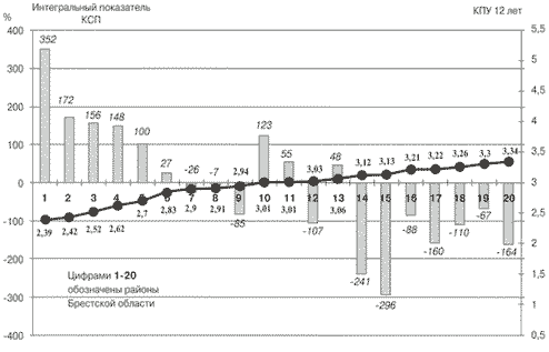 Рис.1. Интегральный показатель качества стоматологической помощи (КСП) и средний КПУ 12-летних детей в различных административных районах Брестской области, Республика Беларусь, 2000 г.
